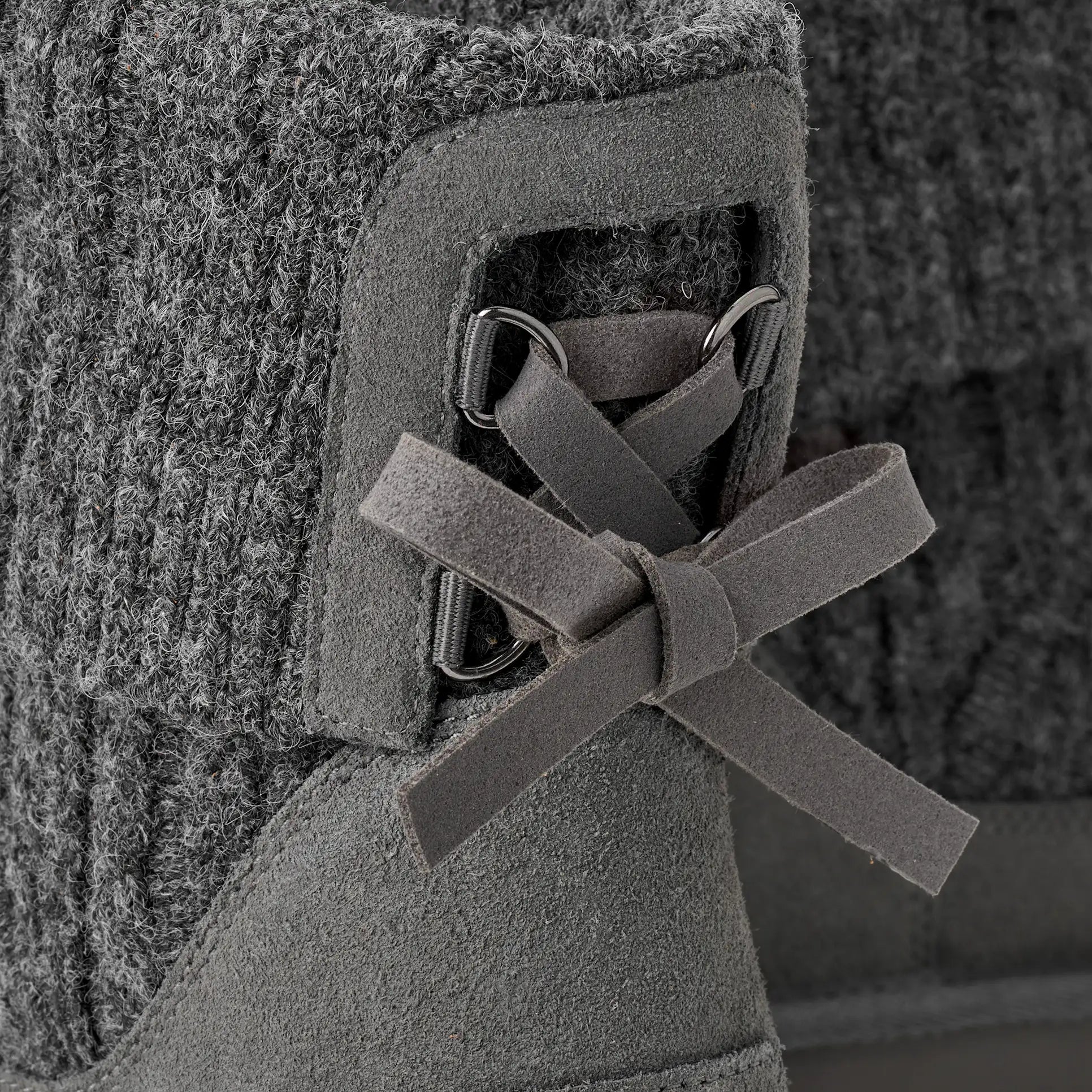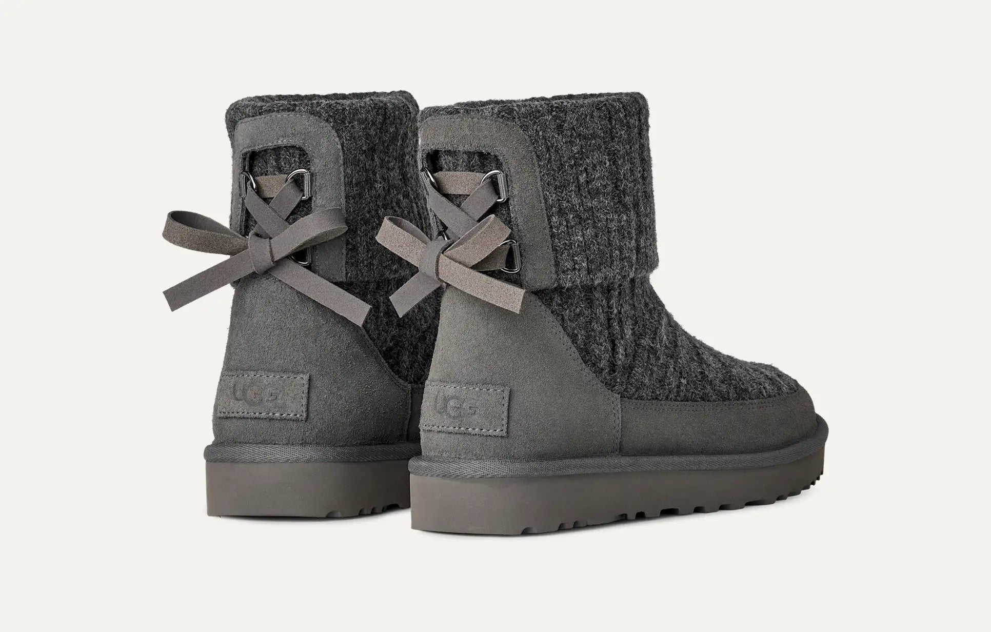 Notre Classic Mini Cabelle en maille. Idéale pour aller savourer une tasse de chocolat chaud, elle présente une tige qui rappelle le pull en maille torsadée que vous adorez. Dotée de détails en daim lisse, elle présente également des lacets en daim assortis et une fermeture à anneau en métal à l’arrière.