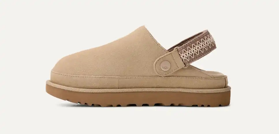Confectionné en daim velouté, ce sabot à plateau polyvalent va avec tout. L’essence même d’un sabot, c’est son confort et en la matière, le sabot Goldenstar se montre à la hauteur ! Avec sa lanière pivotante UGGbraid emblématique, ce sabot se porte de deux façons, soit avec la lanière enserrant le talon, soit avec la lanière sur le dessus et le talon libre pour l’enfiler et le retirer rapidement. Une semelle extérieure ultralégère assure amorti et maintien tout au long de la journée.
