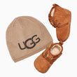 A wonderful baby shower gift for style-driven moms and dads, this suede bootie and knit logo beanie make the perfect pair.