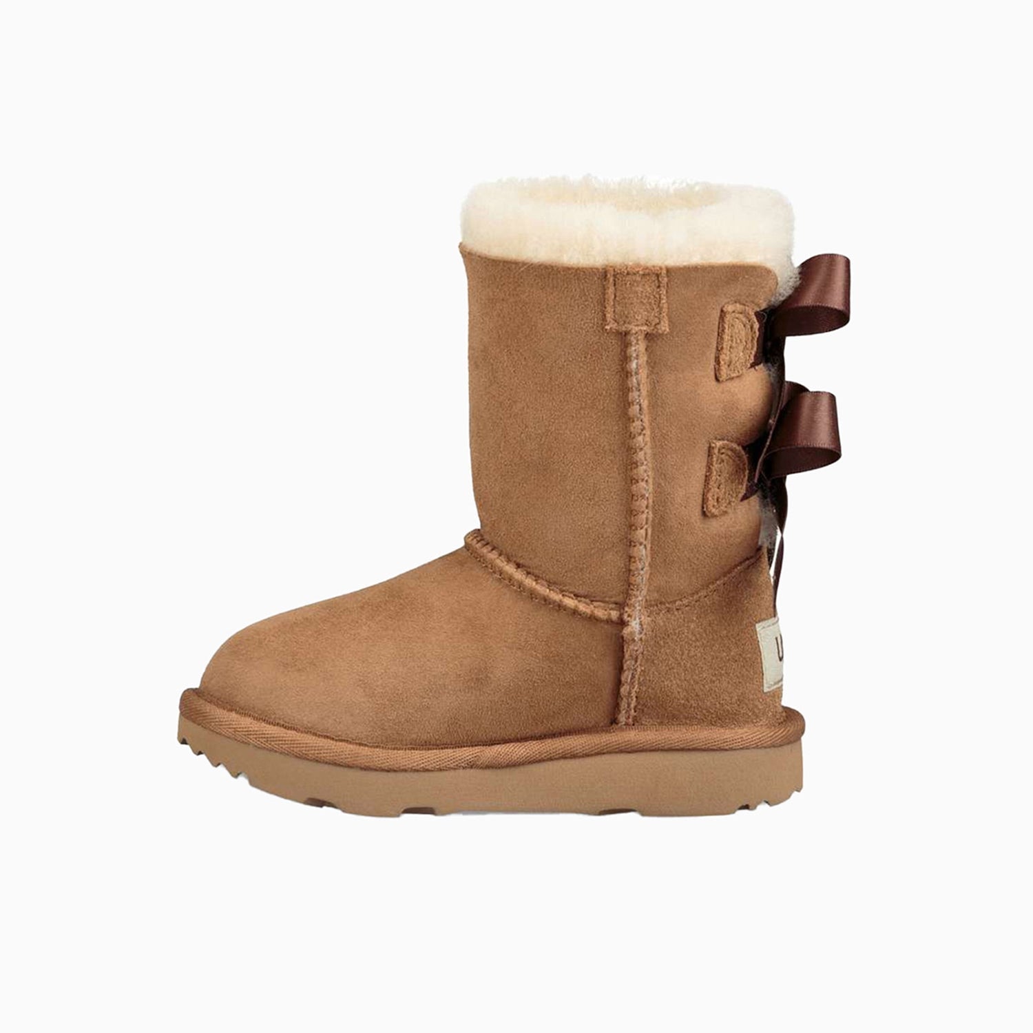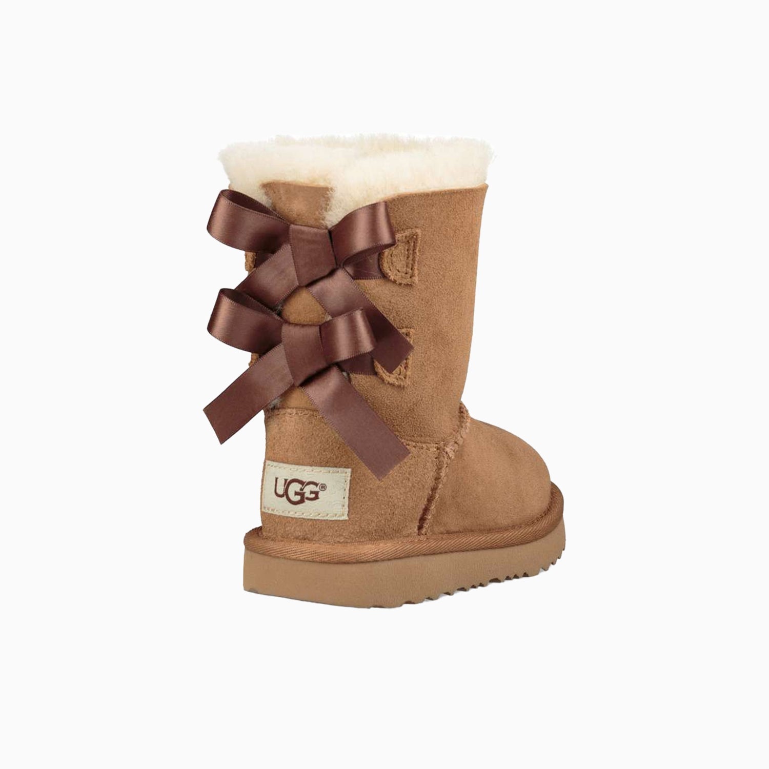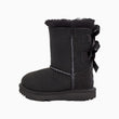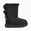 Bow yourself in the footcare style of UGG Kid's Bailey Bow II Toddler Boot featuring protected: post-applied treatment, topically applied water repellency treatment, 17mm Twinface sheepskin upper, fixed satin bows along the back shaft, 17mm sheepskin lining, 17mm UGG pure upcycled wool insole or 17mm UGG plush 80% upcycled wool, 20% lyocell insole, foam footbed, tread lite by UGG outsole for comfort, polyester binding or textile binding made from 100% recycled polyester fibers, 4" shaft height, woven heel label with UGG logo.
