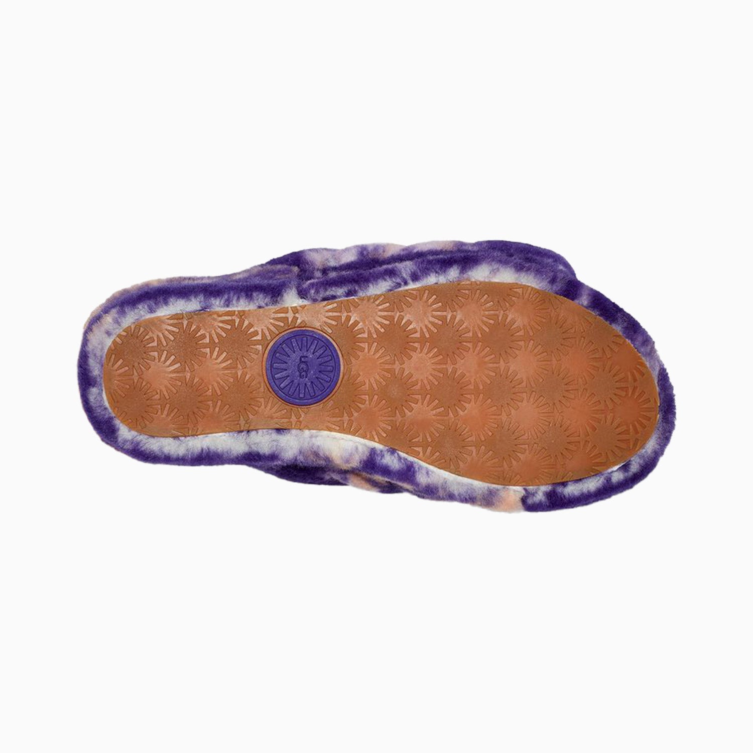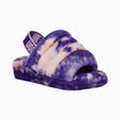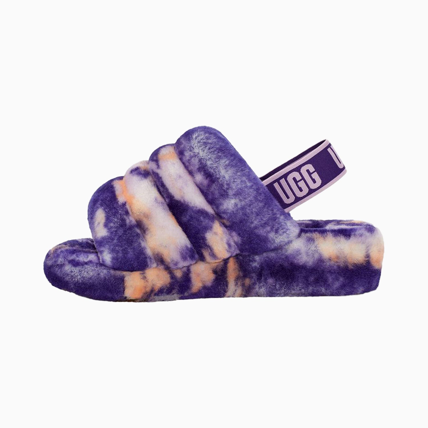 Ultimate comfort in footcare by UGG Women's Fluff Yeah Marble Slide featuring printed sheepskin upper, elastic strap with UGG® graphic, 10mm sheepskin lining, 10mm sheepskin insole, sheepskin-wrapped midsole, molded rubber outsole, 1.5" heel height, woven label with UGG® logo on insole.